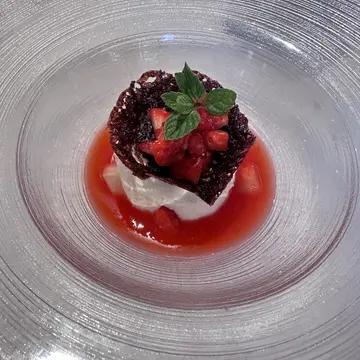 いちごソースに浮かぶ淡雪のクレームダンジュ カカオのチュイールを添えて 小菓子