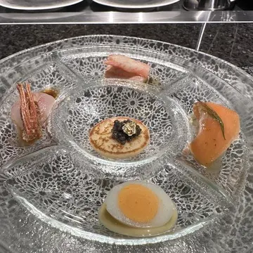 前菜 キャビアのカクテル 北陸産甘エビ 福井県サーモン燻製 越前紅ズワイ蟹