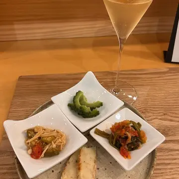 前菜盛りは左のお皿から時計回りに、エノキとオクラのマリネ、ゴーヤのピクルス、ほうれん草と釜揚げしらすのアラビアータ、ジャガイモのおやき「フリッコ」。