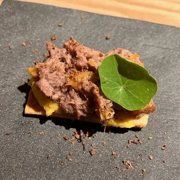黄人参と和牛のリエット。サクサクのタルティーヌ仕立て。