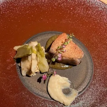 ヨコワのコンフィ。付け合わせの野菜も春らしく。