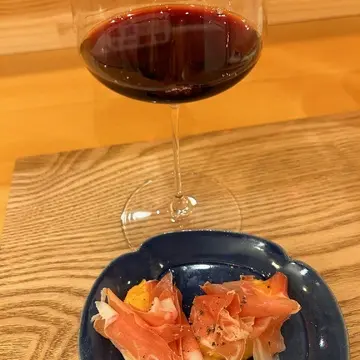 生ハムには黄桃が添えられていて、生ハムの塩っけと甘くフルーティな桜桃がよく合って幸せな美味しさ♡