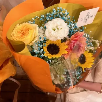 パッと明るく元気なオレンジや黄色がイメージだな〜と思い、そんなリクエストで作ってもらった花束💐