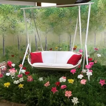 ブランコの下に咲いている花は革製で、ロゴを意識して作られています。