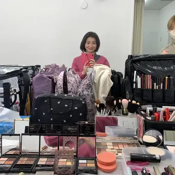 沢山のコスメが並んでメイクをしていただいて。