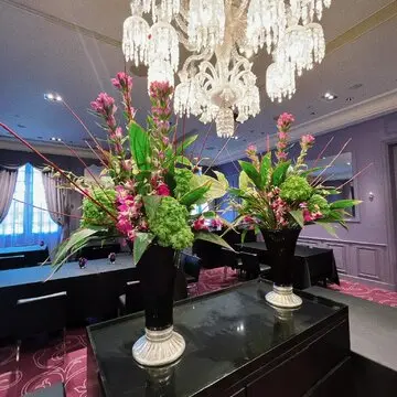 大きなシャンデリアの下には、内装と同じ色合いのお花たち。
