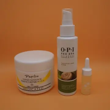Grown Care「キューティクルケアオイル」(右)、O・P・I「プロスパ プロテクティブ ハンドセラム」(中)、Papilio「ハンドマッサージエッセンスリペアN」(左)。