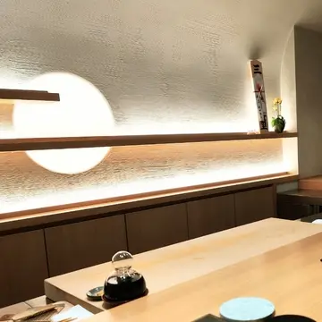 席はカウンター6席のみ。大変落ち着いた雰囲気で、壁面の照明は満月のよう。