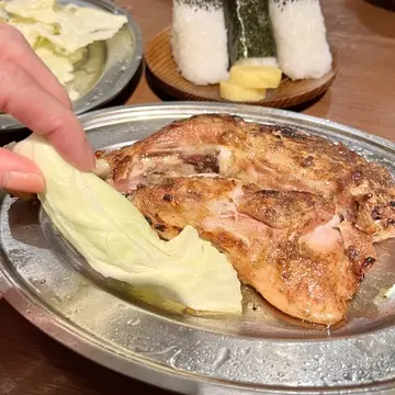 キャベツとおにぎりを鳥のタレ(油)に付けて食べるのも一鶴スタイル♡