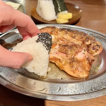 おやどりとひなどりがありますが、私たちは柔らかい骨付鳥ひなどりとおにぎりを注文。