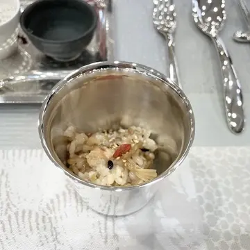 そして、おもしろかったのがシルバー・タンブラーで頂く『韓国風鶏おこわ』。