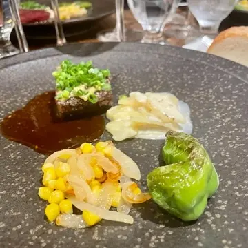 シェフのご厚意で、シャンパーニュに合う食事を少しづつご用意して頂き、カツオの燻製や生ハムメロン、コーン、チーズをふんだんに使ったリゾットなどマリアージュも楽しめました。
