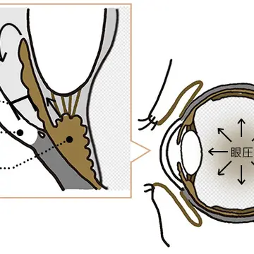 眼圧は、毛様体という部分でつくられる房水が角膜と虹彩の間の隅角を経てシュレム管という排水路から出ていくことで一定に保たれている。房水の流れが悪いと眼圧が上がり、視神経を傷つけることも。