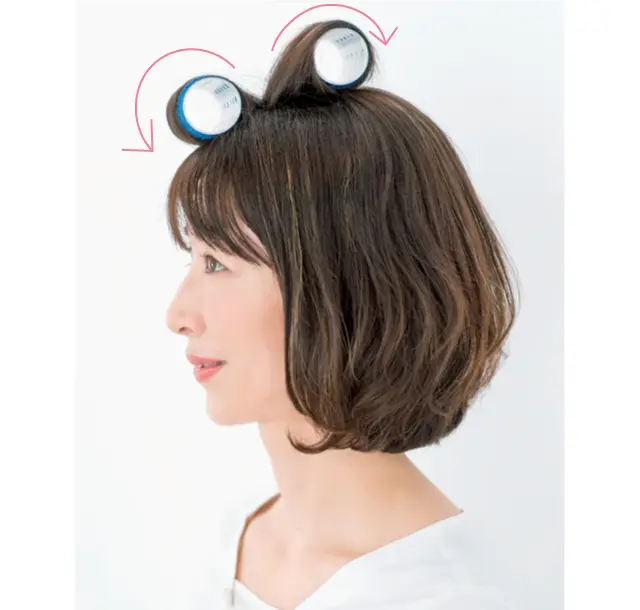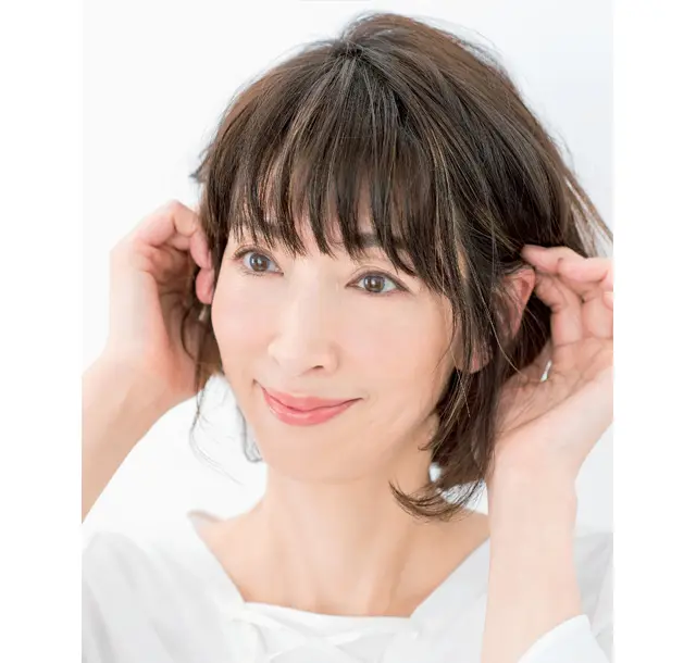 前髪をつくっている場合、全体はゆる巻きで仕上げても、横に流せない短い前髪の処理がむずかしい。「普通に前髪を下ろすと幼く見えやすく、エクラ世代にはちぐはぐした印象に。そこで前髪の表面に丸いカーブをつけてみて。これだけで大人の雰囲気に」(長井さん)。