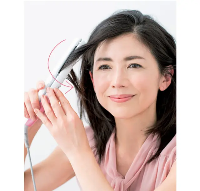 基本は同じゆる巻きの方法ながら、前髪の毛先までアイロンを入れることで、少しきれいめな雰囲気に。「髪が長くても普通のコテで巻かないから、古い印象の"グルングルンの巻き" にはならないはず。がんばりすぎずふだんの延長線上をイメージして」(長井さん)。