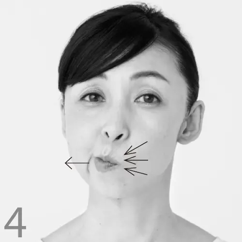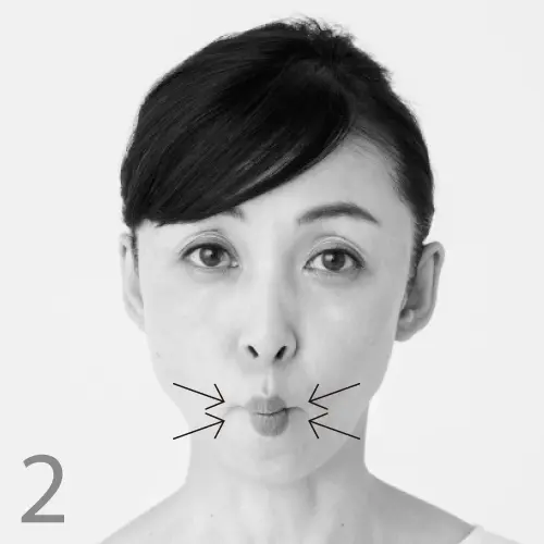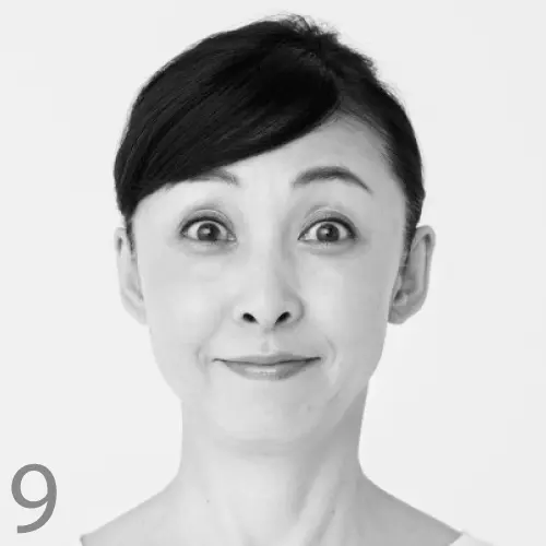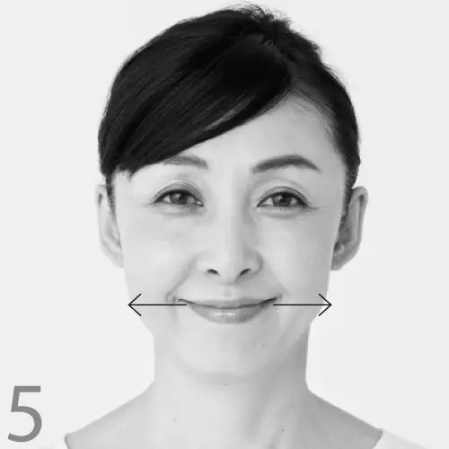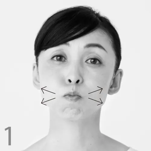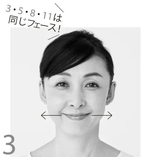 頰、あご、首、額に存在する4つの表情筋を、芯から鍛える運動。こちらも目を大きく開け、顔の筋肉を意識しながら行って。