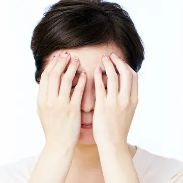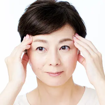 1.第1の開運ゾーン、こめかみをゆるませる 人さし指、中指、薬指の腹をこめかみに押し当て、圧を加えながら小刻みに揺らす。鳥居を通過し神聖なエリアに入るのをイメージし、目の奥の疲れまでほぐすように。10秒ほど続けて。