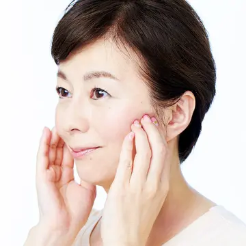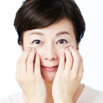 2.疲労がたまりやすい頰骨の下をほぐす 頰骨の下は、心と体の疲労とストレスがコリとなって現れるスポット。親指以外の4本の指の腹を押し当て、圧を加えながら揺らして。約10秒。笑顔がつくりやすくなり、むくみがとれる。