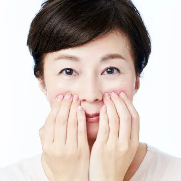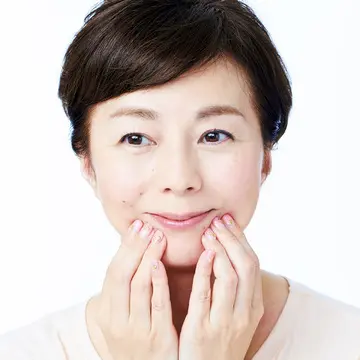 1.感情が表れやすい頰の高いところをほぐす 頰の高いところは、感情が表れやすいスポット。親指以外の4本の指の腹を押し当て、圧を加えながら小刻みに揺らして。10秒ほど。頰がふわっと軽くなり、チークゾーンが高いニコニコ顔に。