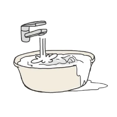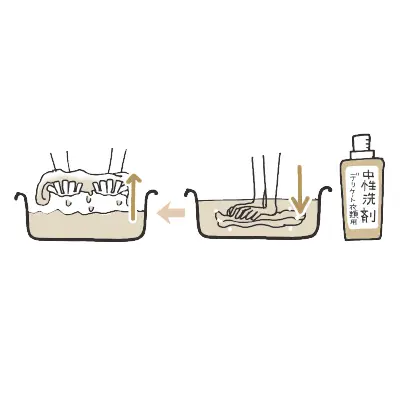 まず、洗浄力を高めるなら、水の温度は洗濯表示の範囲内で高めにしましょう。そして、皮脂汚れが目立つ場合は、事前に簡単な手洗いを(右図参照)。そして洗濯機で細かい設定が可能なら、すすぎを長めに。先ほども説明したように、繊維についた汚れを落とすのは水の役割ですし、洗剤成分が残ると衣類のダメージや黄ばみの原因になりますから、すすぎはていねいに。そして、しわ防止と衣類への負担軽減のために脱水は短めにします。麻などのデリケートな素材のものは専用の中性洗剤で手洗いしますが、洗剤液に沈めて浸透させる程度で強く動かさないようにしましょう。こちらもすすぎはていねいに。泡が出なくなるまですすぎ、ネットに入れて洗濯機で脱水するなら回りだして30秒で十分です。