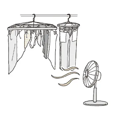洗濯ものは空気の入れ替えが可能な場所で干すのが鉄則。私は浴室に干して換気扇、乾きにくいものは浴室乾燥機を使います。それがむずかしい場合は、あとで説明する乾燥機の併用か、常に扇風機で風を送るなどの工夫をするといいでしょう。干し方は風が通りやすく、表面積が増えるように。しわはたたいてのばし、布ふ 帛はくのものは、ステッチ部分が縮みやすいので、そこをよくのばしてください。