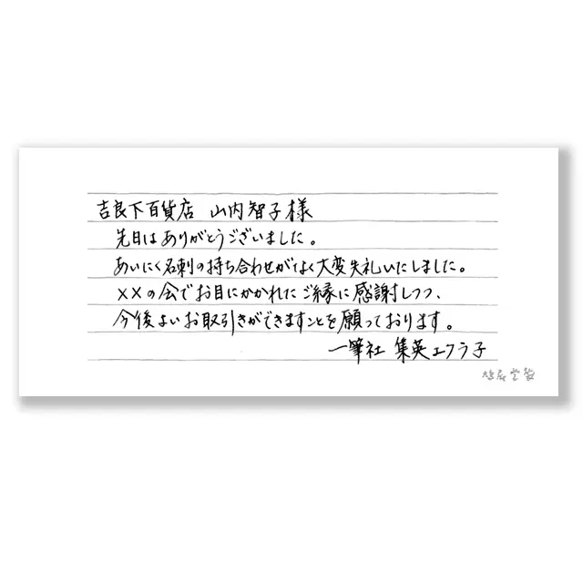 他社のかたに、切らしていた名刺を後日送付するときに。 【POINT_1】 他社のかたあては、社名+フルネームが基本。シンプルな罫線のみの横書き一筆箋に書いているが、面会の折の打ち解け具合から絵柄入りを選んでも。 【POINT_2】 本来は出会った際に完結していたはずのあいさつなので、次につながる結びは必須。関係性を維持したいという気持ちを、しっかりと書き添えて。