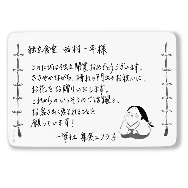 独立開業したかたへの祝い花に添えて 【POINT_1】 祝い花などは、封筒に入れるタイプの厚手のメッセージカードがふさわしい。開業なら、縁起ものの柄を。 【POINT_2】 繁盛につながる結びの言葉を。ご商売なら、「お客に恵まれる」という言葉がふさわしい。ほかに「○○さんの想いが、大きく花開きますように」など。