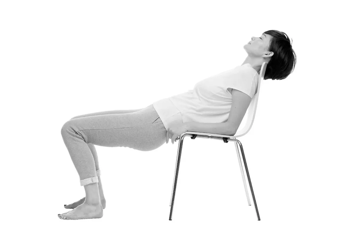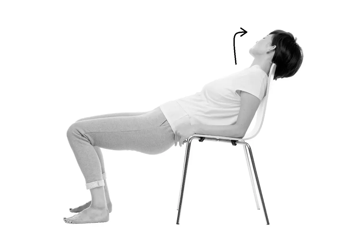 背もたれの上に首の付け根をのせ、顔を左右に向けることで、首の後ろの伸筋群をほぐします。頭の重さが負荷になる、首や僧帽筋上部など、こりやすい筋肉を、効果的にほぐすことができます。