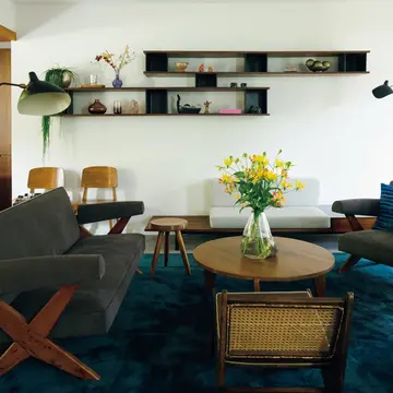 3階のプライベートリビング。インドで購入したという植物染めの黄色いラグがアクセントに。プライバシーに配慮して開けられた大きな窓の外には緑のグラデーションと空が広がる