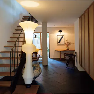屋上の採光システム「ひまわり」が自然光の入りにくい場所に太陽光を届けてくれる。「前の家の玄関にあったトップライトの明るさが気に入っていたので今回も光の取り入れ方は大切にしました」。