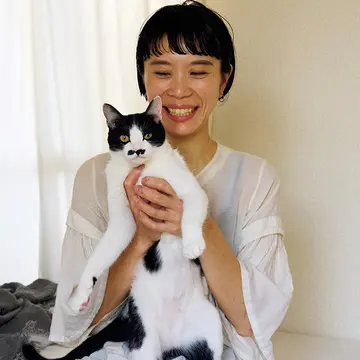 まるで日本の画家・熊谷守一の作品に出てきそうな、細身で手足の長い猫、朝焼(あさやけ)。取材スタッフにもすぐに慣れ、おなかを見せてくれるというフレンドリーさもかわいい。朝焼を飼いはじめたのは、偶然が重なったからと若林さんは振り返る。