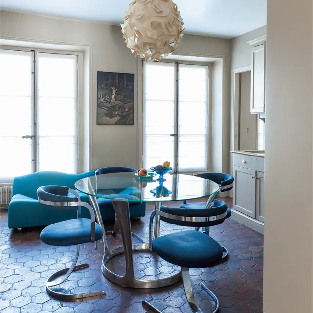 大きな窓が並ぶアパルトマンでは、優しく楽しい色合いとしっとりとした北欧モダニズムが相まって、穏やかな旋律が流れる。窓際とソファを彩るヨーゼフ・フランクの生地が、異なる世界の仲介に。