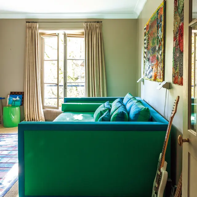 メディアルームでグラフィック感を主張するのは、ジャイプールから運んだカーペット。1年の分3の1を過ごすインドでは、あらゆるものをパーソナライズして注文できるのがおもしろい、と彼女はいう。さらにモダンデザインの巨匠、ピエール・ポランによる椅子に合わせ、ソファの生地とウィリー・リッツォによる鏡のテーブルの表面も、ブルーで統一。いずれもミッドセンチュリーのものだ。