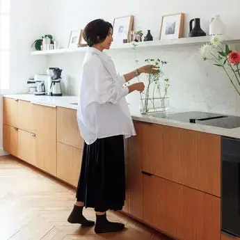 直線と曲線のバランス感、ブラン・ショーと呼ばれる微妙にイレギュラーでニュアンスのある白壁のペイント、前述した視線の位置、とアーレムの住まいは隅々までこだわった、完璧な空間だ。色調は白と黒、グレーのモノトーンに、木のライトブラウン。とはいえストイックな印象は与えずむしろ温かみがにじみ出るのは、陶器の素朴さや植物によるアクセントのおかげだろう。