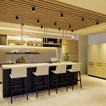 SNS効果もあって、家を建てる、リノベーションするならキッチンハウスのキッチンという人が増えているという。なかでも人気はグレー、ブラック系のキッチン。キッチンハウスの象徴ともいえるエバルトというメラミン素材をカウンタートップと扉にあしらった、ニュアンスのあるおしゃれな仕上がりだ。一方で、より選択の幅が広いフルオーダーキッチンの発注も増えていて、個性的な突き板などを用いた唯一無二のキッチンを求める人も多いという。フルオーダーではクラシックからモダン、ナチュラルと多様なスタイルが実現する。