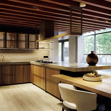 トリュフという名の一点ものの突き板を、扉やダイニングテーブルの天板に贅沢に使用したフルオーダーキッチン。最近は、写真のようにキッチンとダイニングテーブルがストレートにつながっているプランが人気だとか。