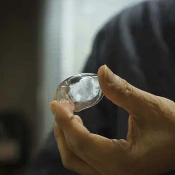 くりぬいた目に玉眼を内側からはめこんだ様子。水晶は専門の職人によって、かなり薄く作られている