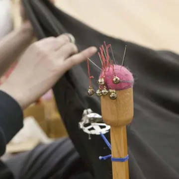 仮縫いから染、そして刺繍などさまざまな人の手作業を経てやってきた鏡獅子の衣裳。