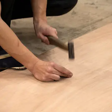 のこぎりで木を切る音や釘を打つ音が鳴り響く制作現場