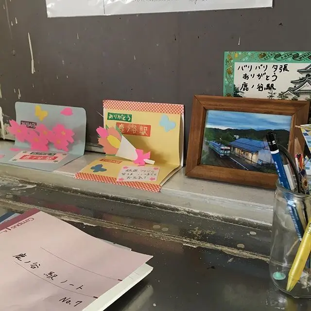 撮影途中で訪れた「鹿ノ谷駅」は、地元のボランティアの方々の飾りつけによって最後のにぎわいを見せていました。なかには「鉄道ファンの皆さんいつまでもお元気で」とのメッセージカードも。何という慈悲の心。ありがたくティッシュをひとつ頂戴しました。