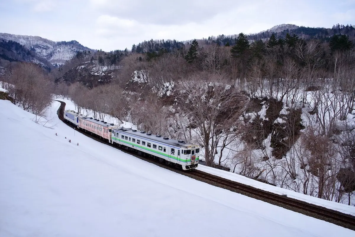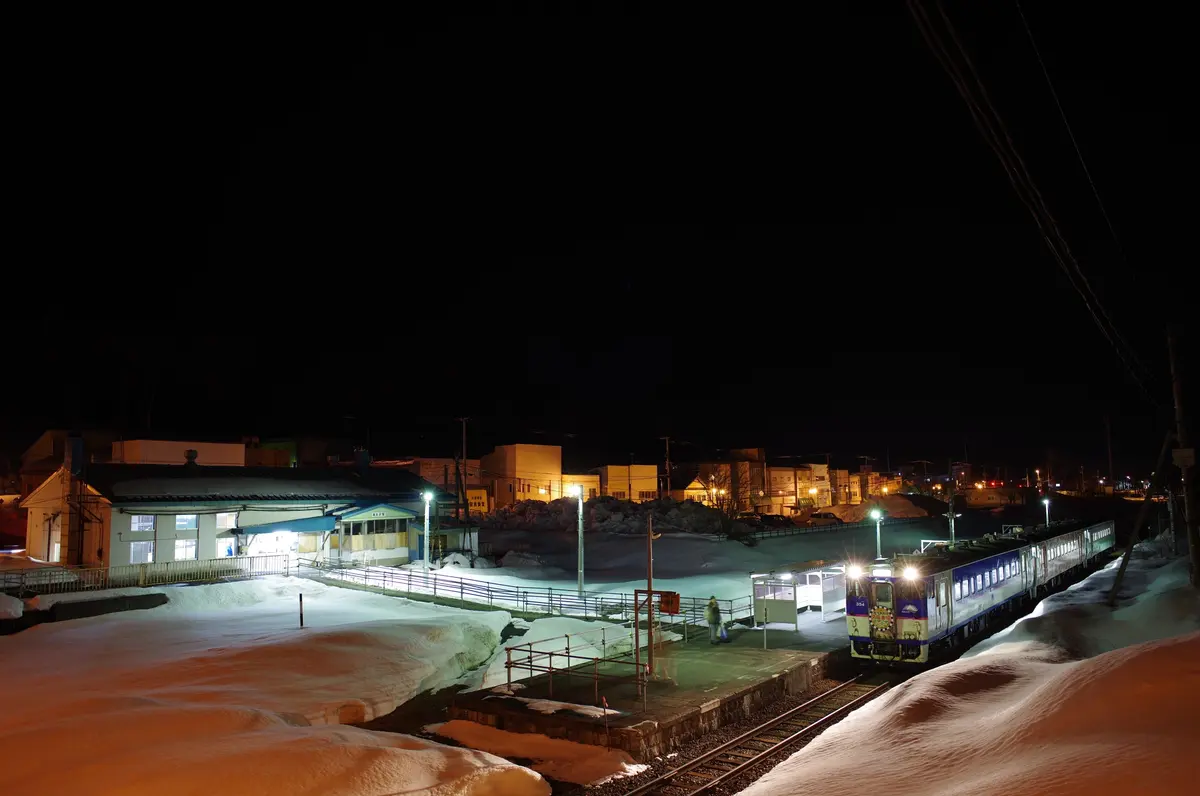 前回訪問時からブランクがあり、ダイヤ改正後の状況も確認していなかったので、増結3両編成が一日8往復、しかも車体色が完全なちゃんぽんと知ってしばし呆然となりました。夜の清水沢駅の停車風景だけを撮るつもりだった私の手元には、単焦点の広角レンズのみ。なのに、下り方面先頭が日高線塗装の車両とな…(希望のJR北海道色は後端)。いきなり猛烈な後悔を抱えてのスタートとなりましたが、後がないタイミングではやるっきゃない。もう何があっても一切が「思い出」です。