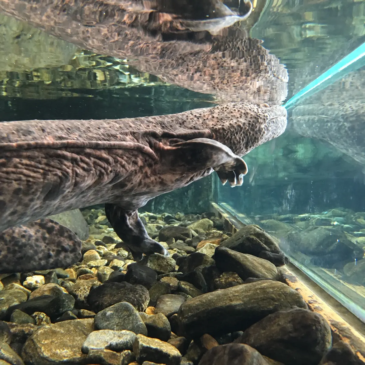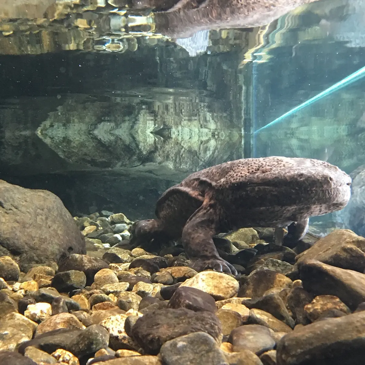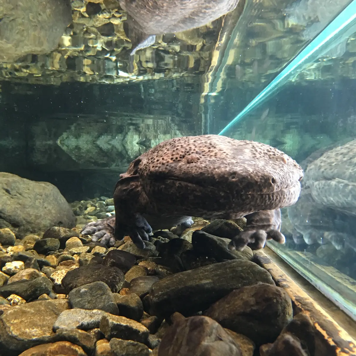 その後、図録を買いに行ったショップの奥にオオサンショウウオの「さんちゃん」がいて、これが望外の喜び!! 人馴れしているのか、服のチェック柄にぐっと来てるのか何だかよくわかりませんが、真っ昼間から気持ちよさそうに動いてくれて、かわいくてしょうがありません。顔のイボより小さい目や、前肢と後肢で指の数が違うところがチャームポイントの特別天然記念物です。