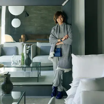 「FIBER ART STUDIO」は寝具、タオル、ブランケット、部屋着、ラグなど暮らしの質を上げるホームファブリックを扱うショールーム。お店の魅力を、モデル・富岡佳子さんがご案内します。