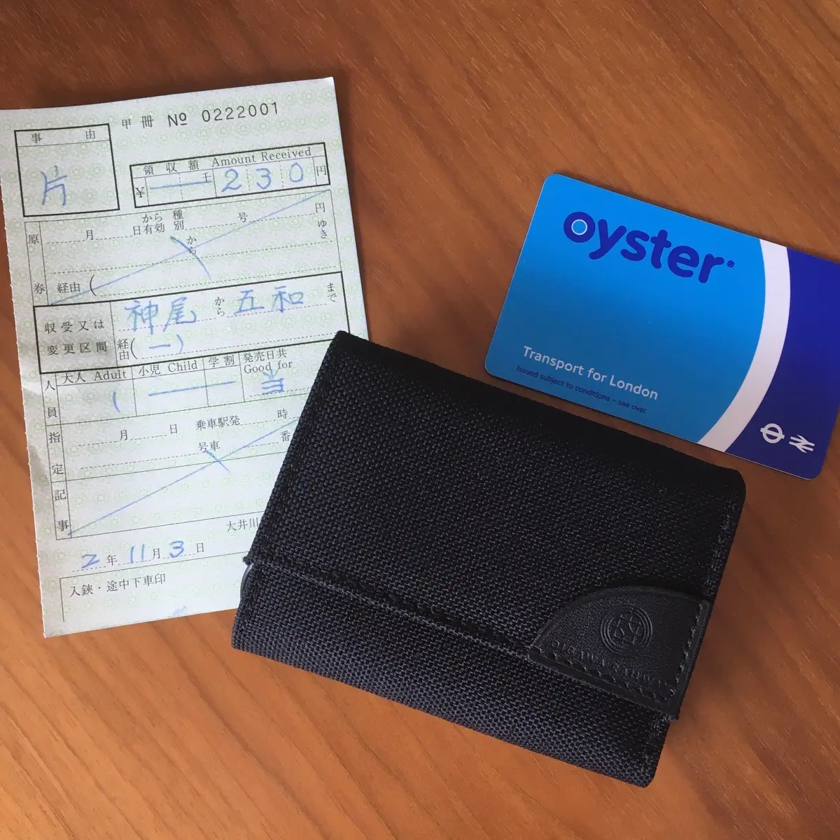 お土産にしたのは、「五和」の駅名入りのきっぷと「週末財布」。財布は、縁のレザーパッチに大鉄のロゴが型押しされた三つ折のコンパクトなもの。コーデュラナイロンを使っていて丈夫そうです。レザーのコバを黒で塗ったら、「オールブラックでよりSLっぽい質実剛健感が出たような♡」と自己満足に浸って終わった(鉄道)文化の日、でありました。