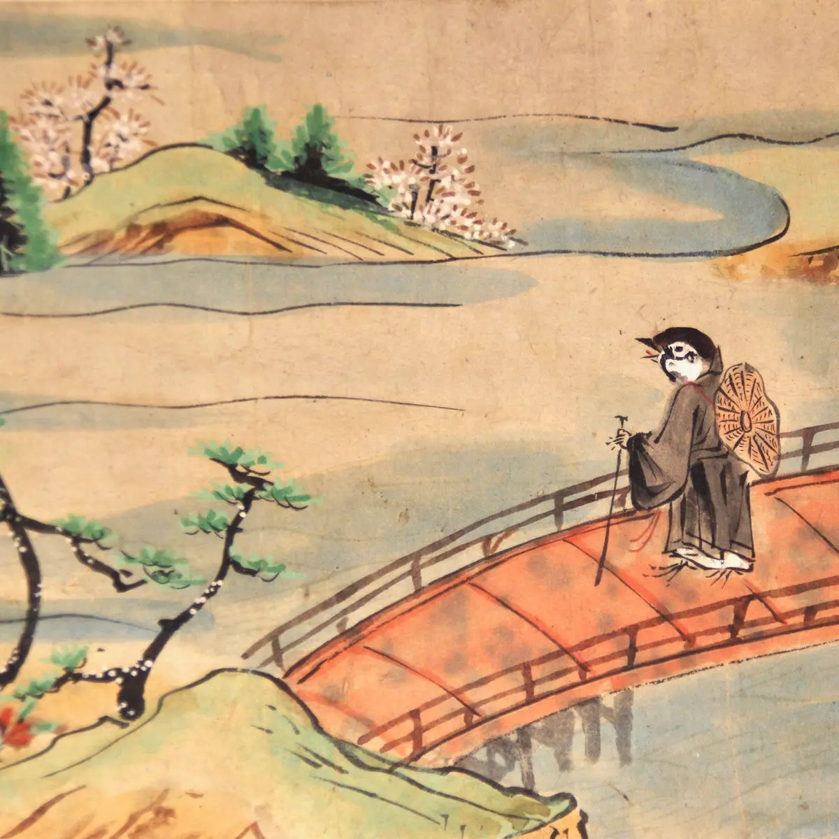 実際、二人は黙々と歩くしかないでしょう。石堂丸の前を行く苅萱道心は、すぐにも息子を抱きしめて慰めてやりたいと思っているはず。しかし、出家した身ゆえに、どうしてもそれができない。その「心中を察して余りある」状況に過剰な描写は要らないと、描き手はよく分かっているようです。手前の土坡と奥の山のゆったりした曲線は、二人の悲痛な胸の内に対して、絶妙な対位法となっています。そして、次の荼毘に付す場面で初めて、二人ともが泣くのです。