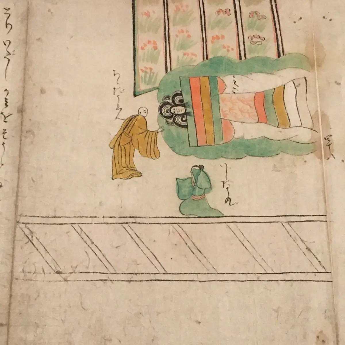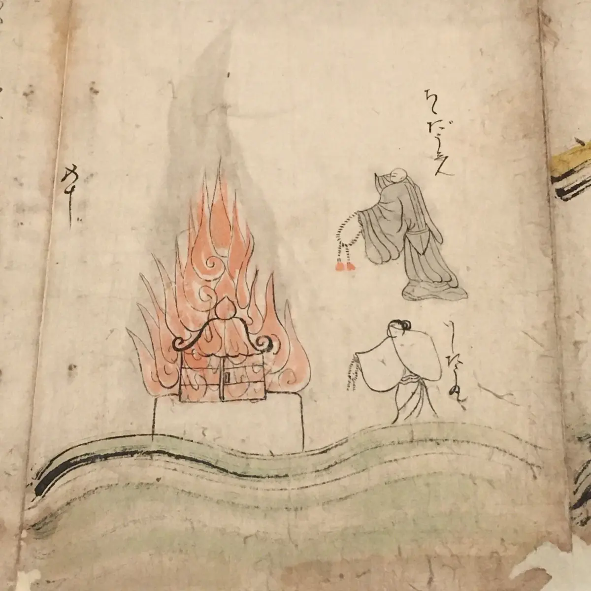 恥ずかしながら私には解読不能のテキストにおいては、妻の遺体を前にした道心の取り乱しっぷりが記述されているそうですが、絵の中で袖を濡らすのは石童丸のみです(写真2枚目)。道心が亡骸を目の当たりにした瞬間を描いているというべきか。