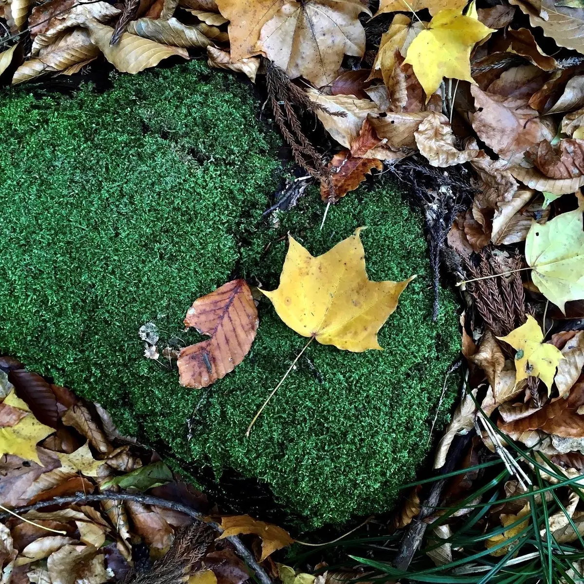 写真1枚目は手前が楓、奥が銀杏。2枚目は苔の上に落ちた板屋楓の葉です。