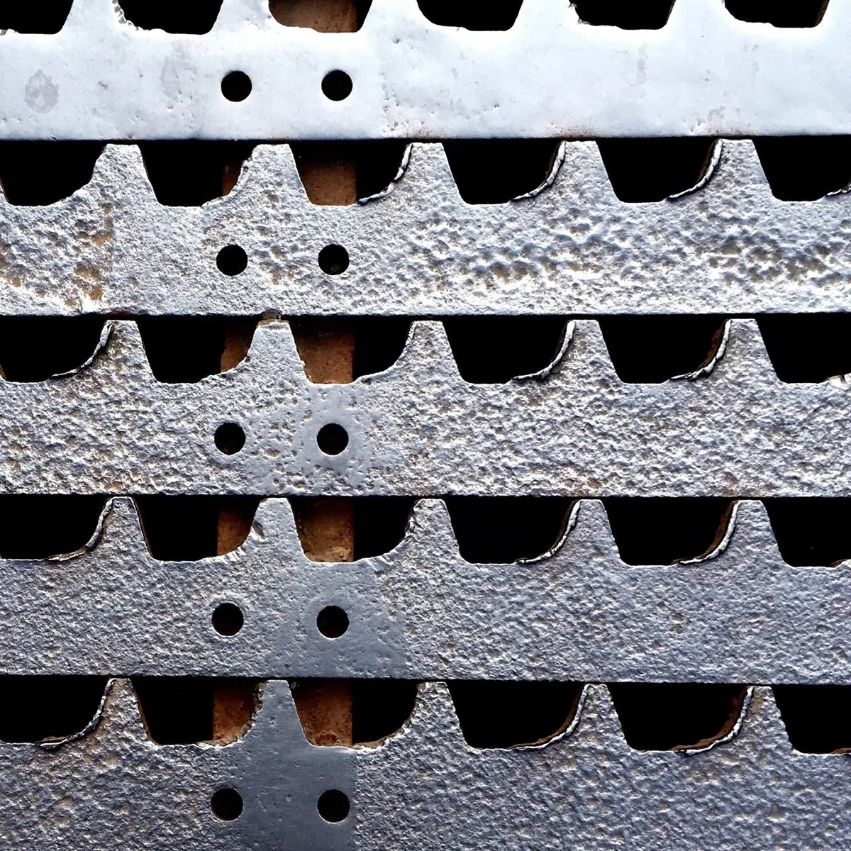 写真はJR横川駅前の排水溝の蓋いです。レールの固定穴がピタリと揃っていてなかなかの美観を誇っています。これは、EF63を補機とする新線の完成後に、廃材となった旧線のラックレールを利用したものと思われます。この手の再利用物件が群馬県下に点在していますので、ギザギザで2つ穴の空いた鉄板を見かけたら、「あっ、アプト式!」と思い出してください。