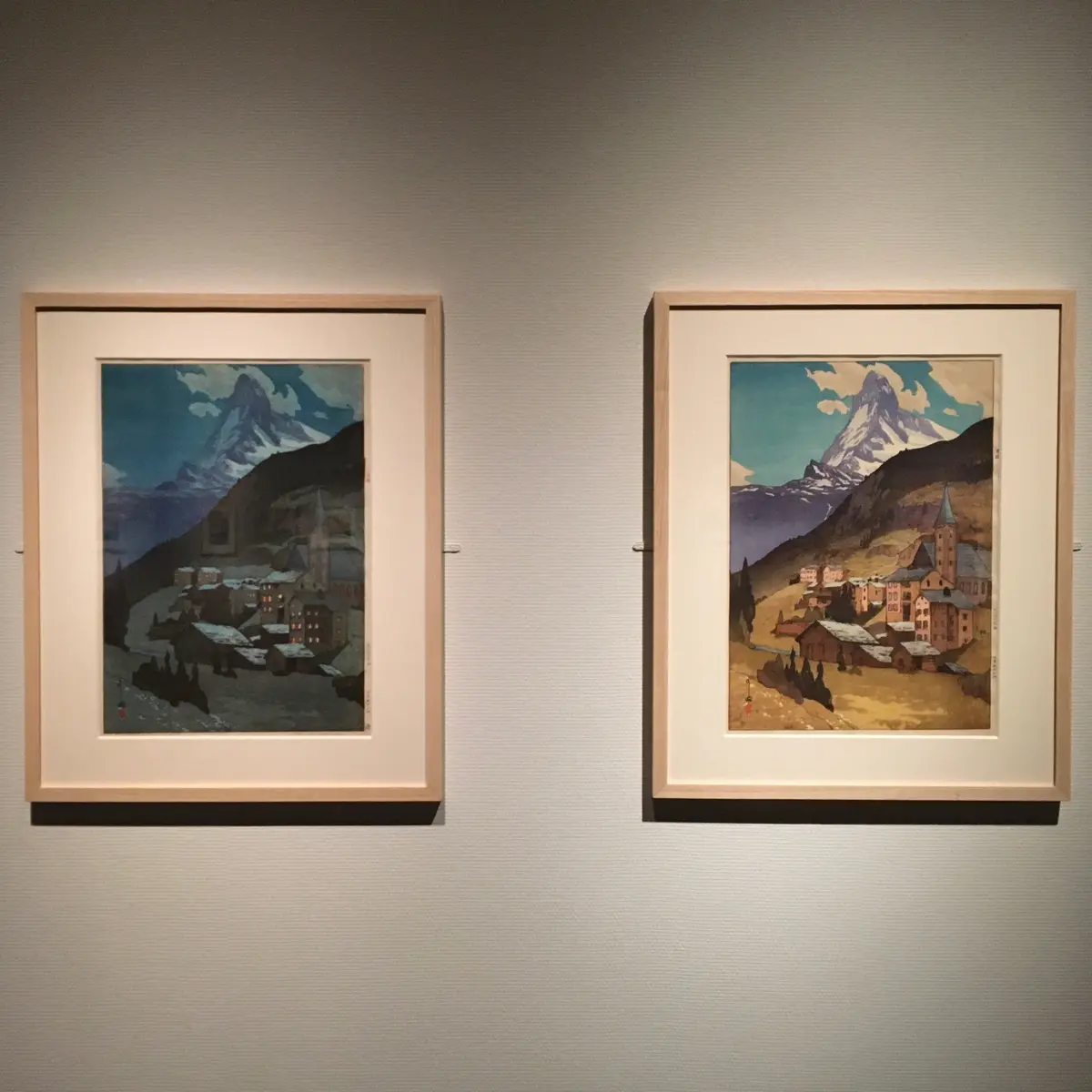 吉田が木版画に本格に乗り出したのは40代から。海外で粗悪な浮世絵版画が持てはやされていたことを恥じたのがきっかけでした。壮大な山容、透明感ある水流、見事な諧調を帯びた空などを、西洋画的な写実描写をベースに木版画化しています。
