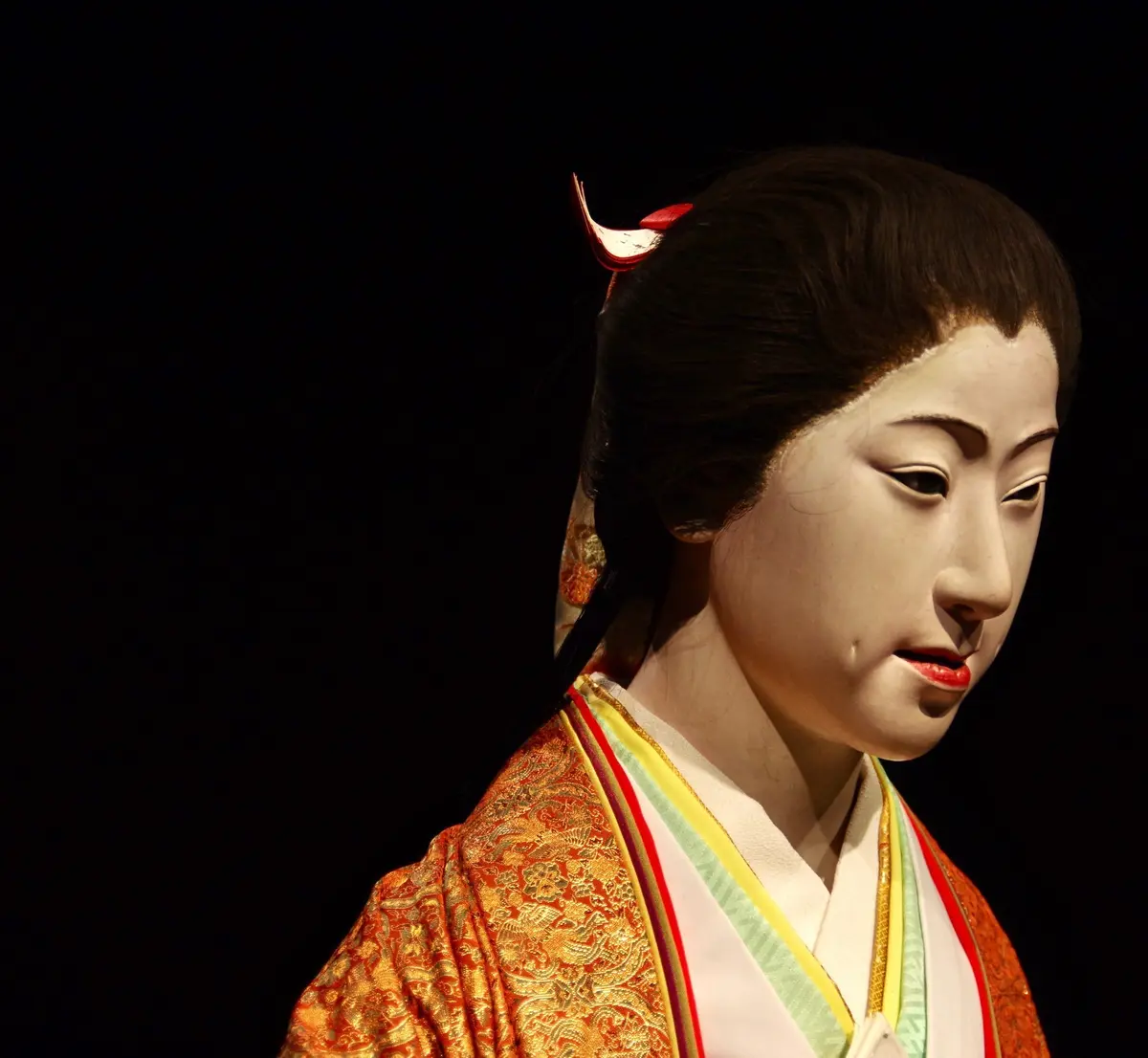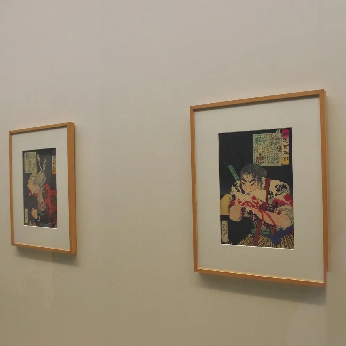 また、幕末~明治初期の「あやしい絵」も出品されています。会場には近代日本画家の鏑木清方の作品が多数並びますが、その画系をさかのぼると、”血みどろ絵”の月岡芳年(写真4枚目)、”妖怪絵”の歌川国芳たちがいたのでした。そして、絵ではなく"立体"ながら、この時期にピークを迎えた「生人形(いきにんぎょう)」一体も参戦。写真4枚目は、安本亀八の『白瀧姫』です。西洋彫刻もビックリの、3Dハイパーリアリズム作品もあるのがこのジャンルでした。